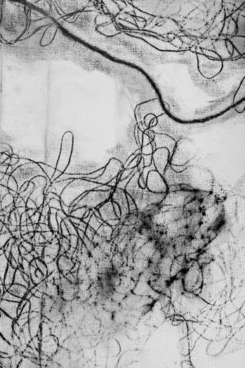 “ Network Constellation ” is an artwork composed of five drawings of varying sizes, executed in graphite and pressed charcoal on canvas. They are arranged as a collage, mounted on a wall, in a polyptych. They belong to the Out of Frame series, whose common denominator is the lack of a frame, that is, without a containment structure; as a symbolic gesture toward a need to break free, reconnect, and open up to new experiences. In this polyptych, I explore a constellation of fragments of those networked energies, that invisible network that connects us and is found both in outer space and within us; like endless electrical leaks. I am interested in investigating the connection between macro and micro universes, which replicate themselves, in turn, one within the other, successively, toward infinity. I create internal psycho-geographical constructions (or inscriptions), where line, space, and light articulate perception.